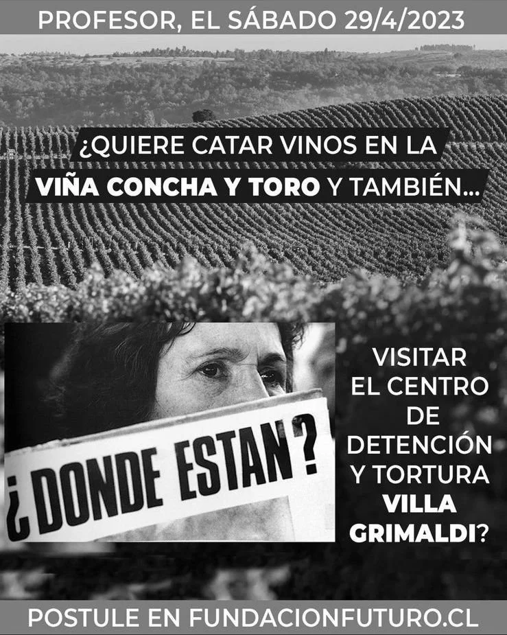 La actividad se promocionaba como “Quiere catar vinos en la Viña Concha y Toro y también visitar el Centro de Detención y Tortura Villa Grimaldi?”. Además, el afiche contiene la foto de una familiar de una persona detenida desaparecida.